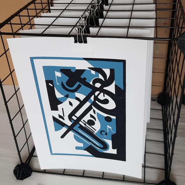 Linoldruck DIN AA4 zweifarbig blau und schwarz