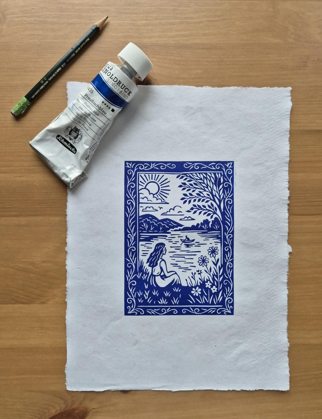 Linoldruck, wasserbasierte Farbe auf feinem Büttenpapier A4